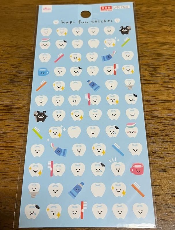 This product is a packet of "Hapi Fun Stickers" with a tooth theme. I found them at my local Daiso recently, and they were priced at 100 yen plus tax (110 yen in total).
