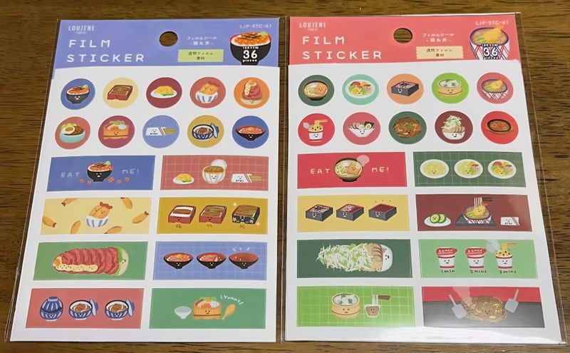 These products are packets of film stickers with a Japanese food theme. They're from the Loujene Tokyo brand and I found them at Seria, each item was 100 yen plus tax.