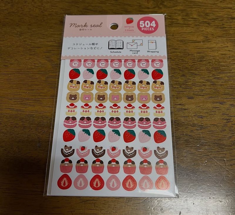 This product is a packet of "mark seal" stickers which depict strawberries and sweets. I found them at my local Seria store recently and they were priced at 100 yen plus tax.