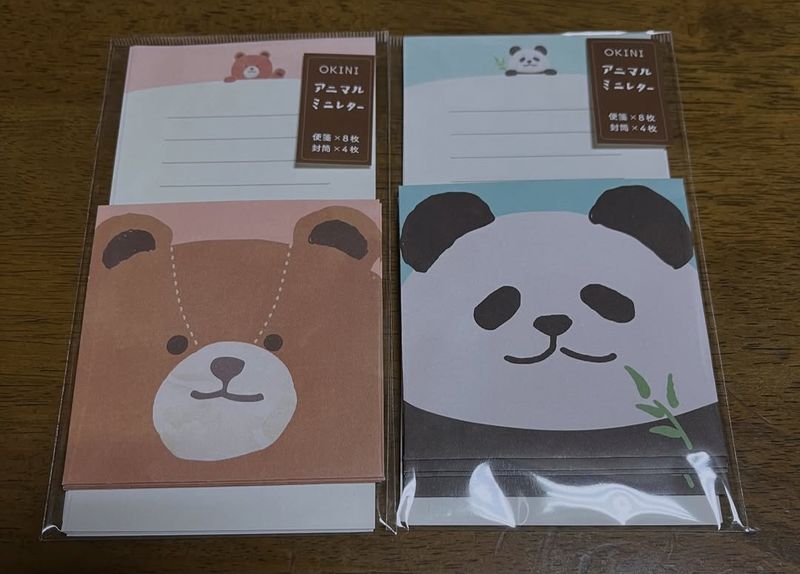 These products are animal-themed mini letter sets (one in a general bear theme, one in a panda theme) from the Okini brand at Can-Do. Each was 100 yen plus tax.