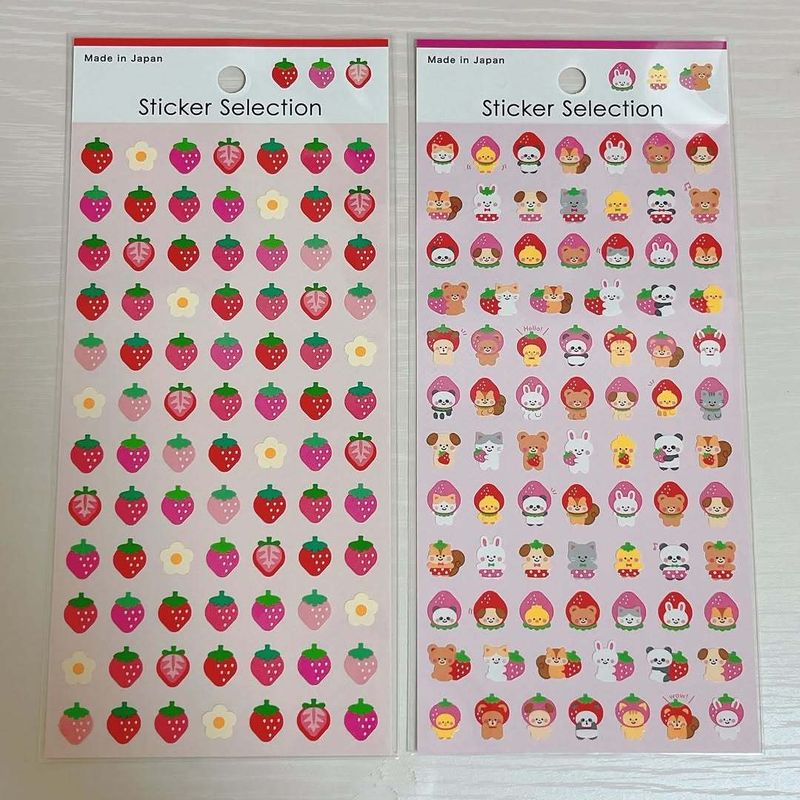 These products are packets of small, strawberry-themed stickers in two different types -- one has berries and flowers, the other has a variety of kawaii characters wearing strawberry hats. Each was 100 yen plus tax.