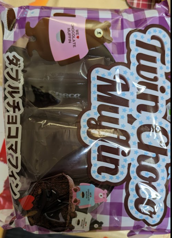This snack product is a pack of seven "twin choco" muffins; chocolate muffins with a creamy chocolate filling. They are individually wrapped with cute bear themed packaging.