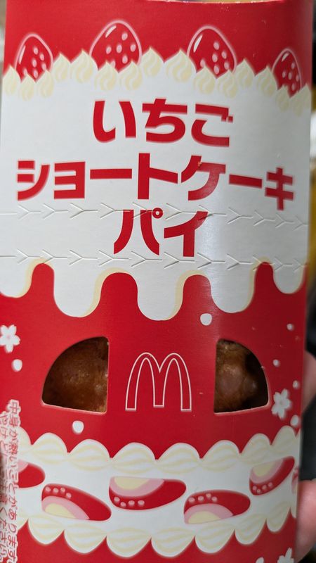 This product is McDonald's Strawberry Shortcake Pie, which is a crispy pie filled with sweet strawberry jam as well as soft shortcake cream. It is served heated.