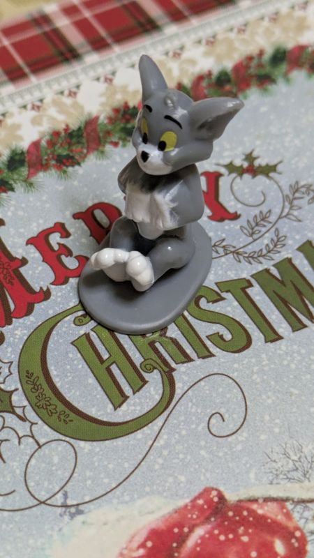 A pack of three individually wrapped milk chocolate eggs. Each egg has a capsule inside and the capsule contains a Tom and Jerry figurine, with a stand.