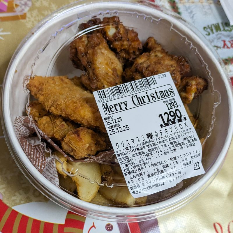 A round festive Christmas chicken box with three types of chicken, two of two and four of the other, and some wedge style fried potatoes available on Christmas Day without a booking.