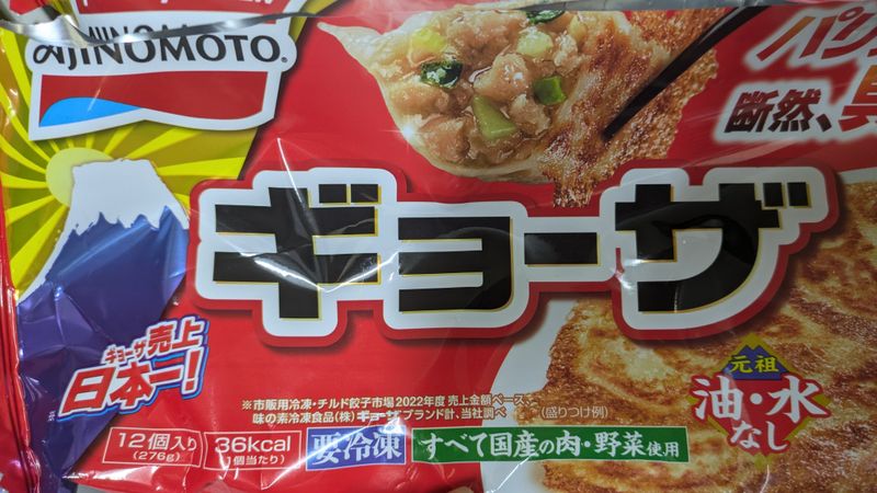 A pack of twelve frozen gyoza, that can be cooked from frozen in less than ten minutes. They do not require water not oil to cook. Reportedly Japan's best selling gyoza.