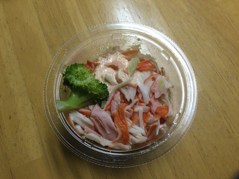 7-11 convenience stores' cup deli, small servings suitable as side dishes or snacks, inclues Kanikama mentai mayo sarada, a salad of crab meat and mentaiko fish roe.