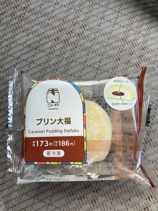 I’m often pretty hungry by the time I embark on my commute home. Fortunately, New Days is there with a range of treats. The Caramel Pudding Daifuku (プリン大福, purin daifuku) was there to fill the gap (in my stomach) and retails for a reasonable-these-days price of 186 yen (tax included).