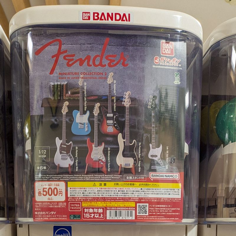 Adorable miniature Fender guitar, which come in two pieces that you put together yourself. It also comes with a stand. They are dispensed from a Bandai toy capsule machine.