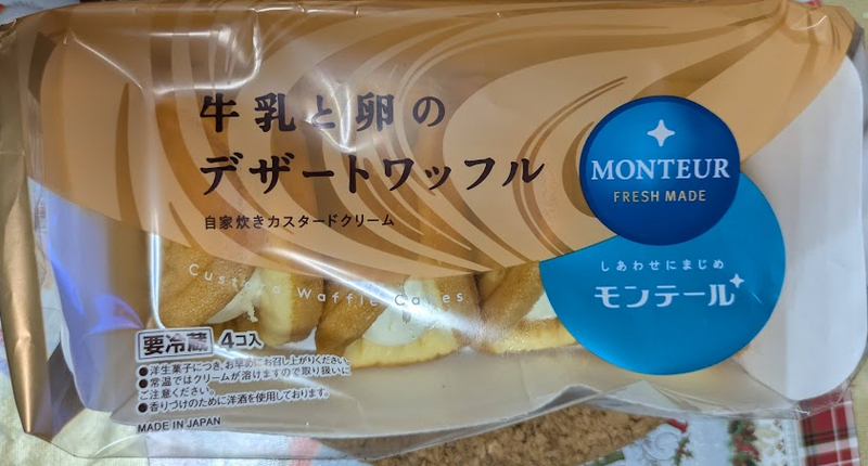 This product is a pack of four soft waffle cakes with a smooth custard-like cream filling that is made from milk and eggs. It is a chilled, freshly made treat by Monteur.