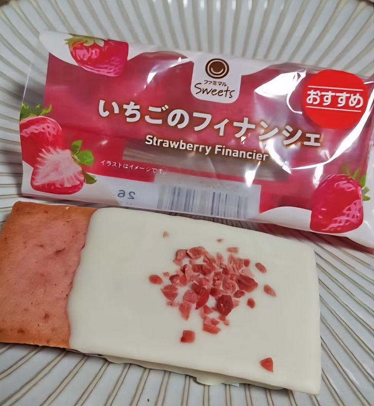 This product is a strawberry financier, and it's a limited time offering from a strawberry-themed sweets range at Family Mart. It was priced at 200 yen.