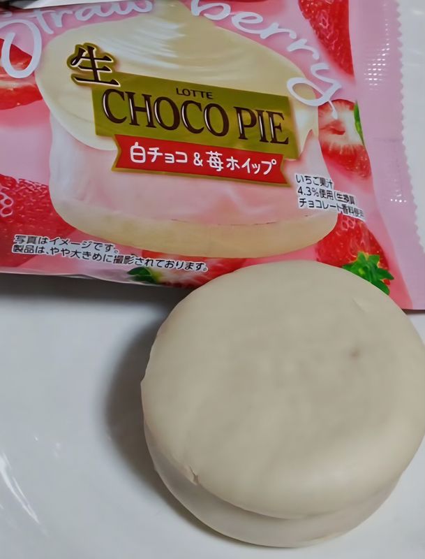 This product is a white chocolate and strawberry whipped cream Chocopie, and it's a limited time offering from Lotte. I found it at my local supermarket and it was priced at 213 yen.