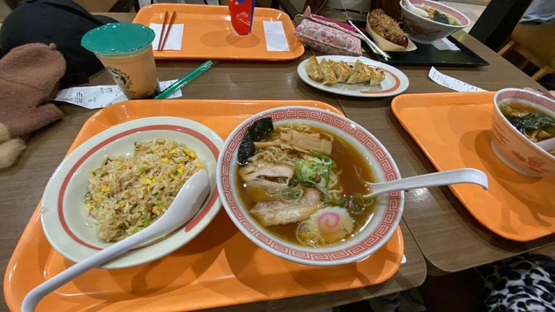 This ramen set features a bowl of shoyu (soy sauce–based) ramen paired with a small plate of fried rice, served on a cafeteria-style tray. The ramen comes in a traditional patterned bowl and includes curly noodles, slices of pork (chashu), bamboo shoots, green onions, seaweed, and a fish cake (narutomaki). The broth is clear brown, indicating a soy sauce base that is light yet savory. The fried rice is simple and classic, mixed with egg, green onions, and small bits of seasoning. This type of set meal is common in Japanese food courts and casual dining spaces, offering a filling and affordable option for shoppers, students, and families. It’s designed to be satisfying rather than fancy, focusing on familiar flavors and comfort.
