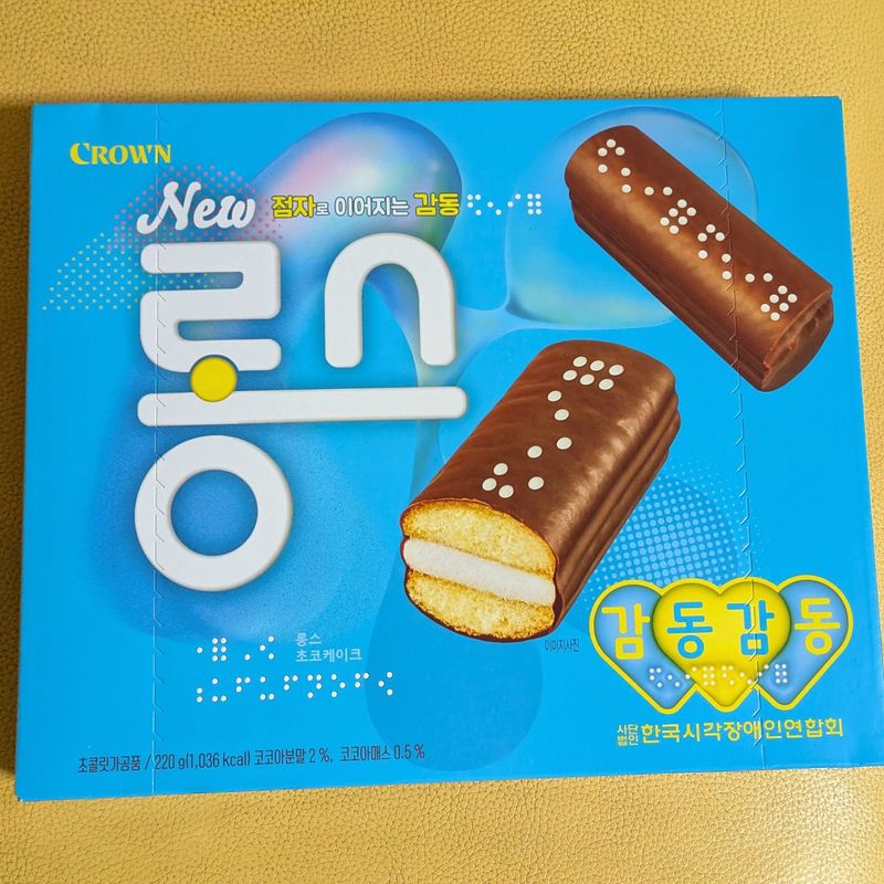 A pack of ten oblong small chocolate cakes with sponge and marshmallow on in the inside from Korea confectioner 'Crown'. There is braille on each cake.