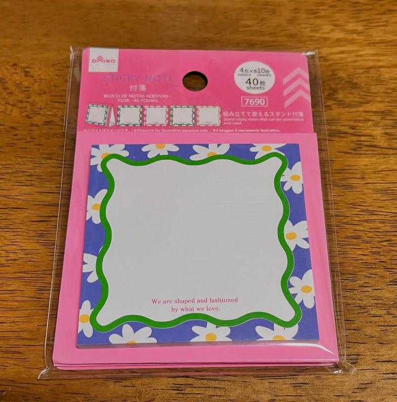 This product is a pack of floral-themed sticky notes from Daiso. There are 40 square-shaped sticky notes in four different designs and they were 100 yen plus tax.