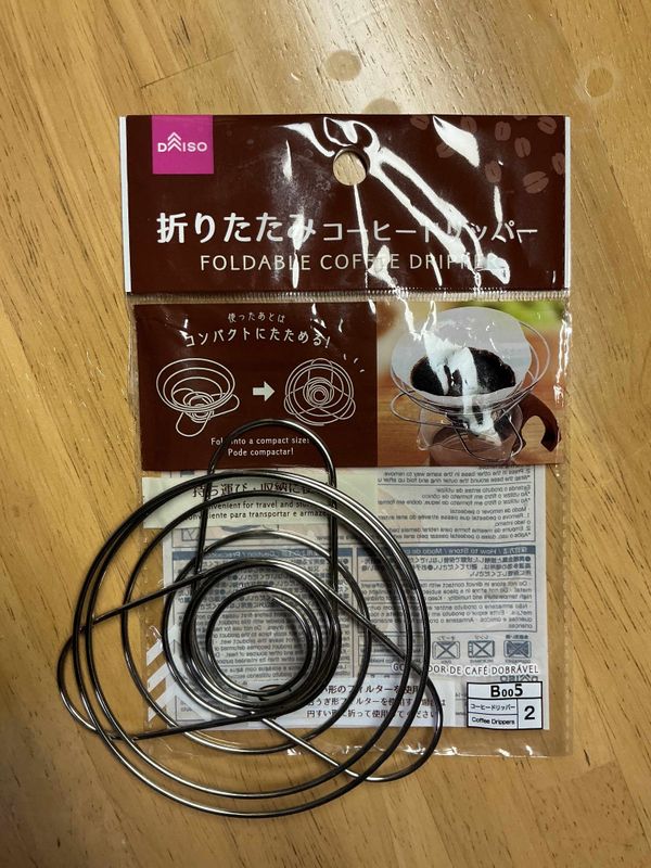 Daiso 100 yen shops carries this stainless steel coffee dripper. The frame has three lobes that hold it over a coffee cup. The item folds easily for convenience.