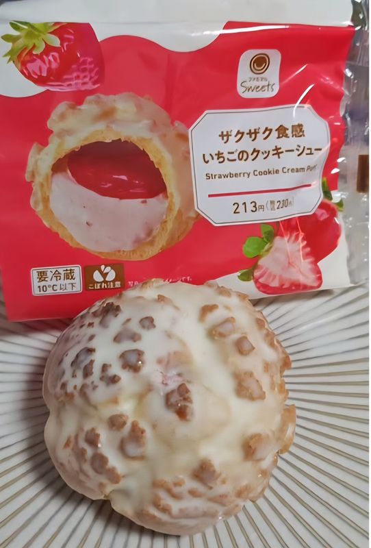 This product is a strawberry cookie cream puff, and it's a limited time offering available from Family Mart stores. It was priced at 230 yen including tax.