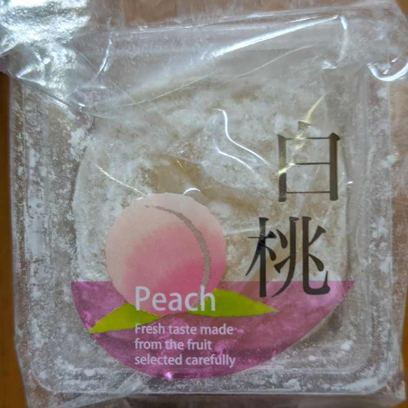 Peach flavor of a non traditional Daifuku with a jelly sauce, rather than a whole piece of fruit, in the center of chewy mochi rice, sprinkled with white powder.