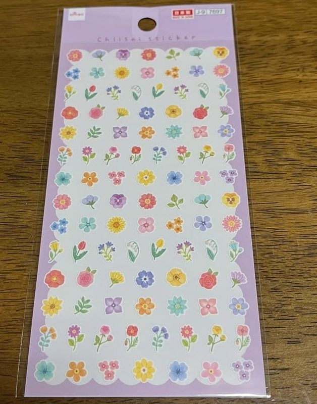 This product is a packet of "Chiisai stickers" from Daiso, and they depict a variety of different flowers. They were priced at 100 yen plus tax (110 yen in total).