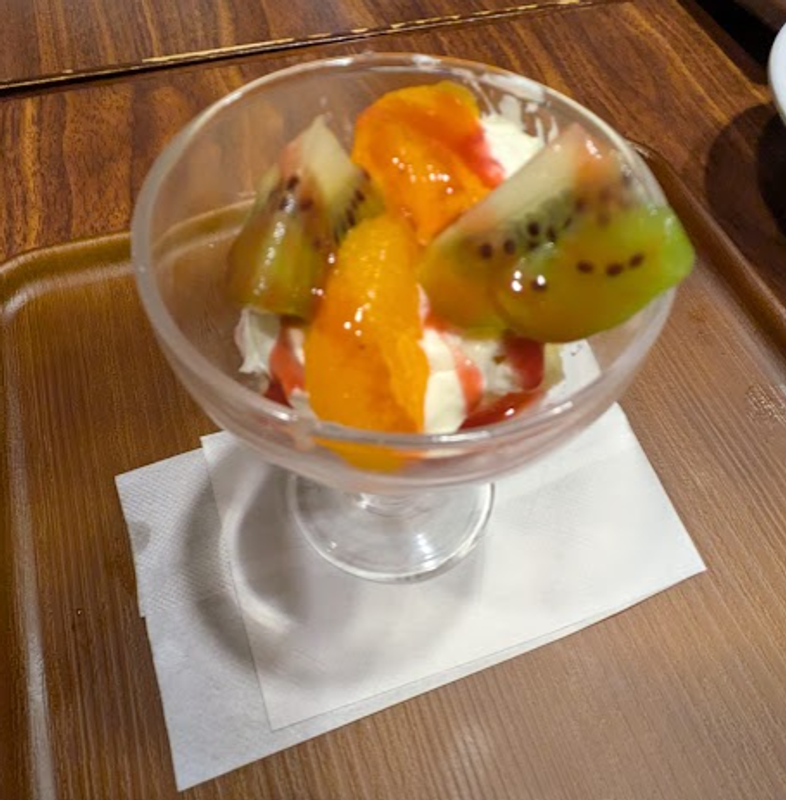 A fruit shortcake served like a ice-cream sundae - in a glass. It is sponge topped with cream with fresh fruit on the top, and a trickle of sauce completes it.