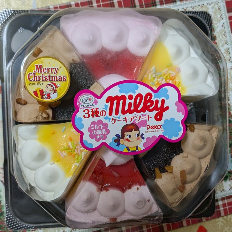 A Fujiya pre-cut cake but of three different flavors, two slices of each for a total of six pieces. Chocolate, strawberry and lemon flavors all with fresh cream.