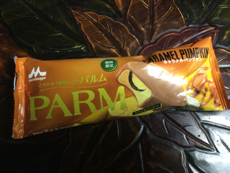 Morinaga's Parm Caramel Pumpkin ice cream bar available at 7-11 convenience stores comes in a single 80 ml bar. It's got caramel coating around a pumpkin-flavored ice cream with caramel sauce.