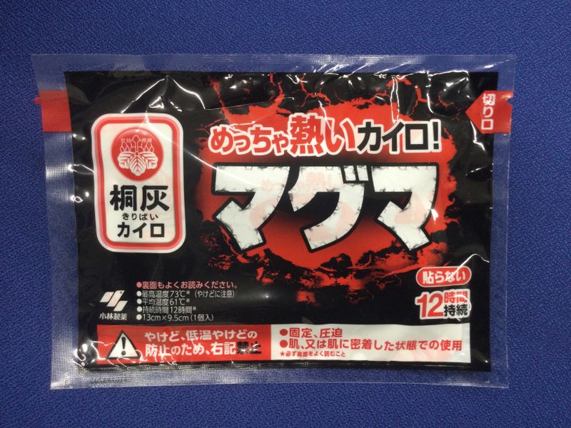 These kairo pocket warmers produced by Kirigai and labeled in bold katakana as Magma are supposed to last 12 hours and heat up immediately upon opening the plastic wrapper.
