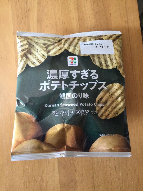 7-11 convenience stores' 7 Premium branded chips are "nokosugiru", too rich, with Korean nori seaweed dusted on thick-cut ripple chips. The 60 gram bag is 148 yen.