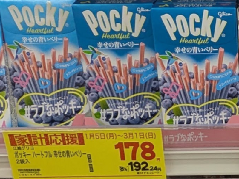 This is a limited‑edition Pocky Heartful flavor from Glico. The “Heartful” line uses heart‑shaped sticks and this flavor is a sweet-tart blueberry chocolate.