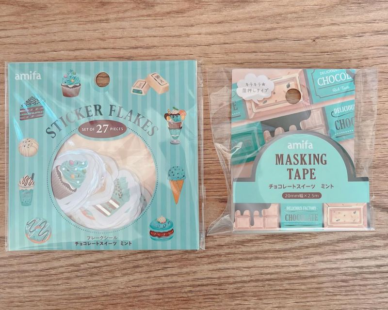 These products are chocolate mint sweet themed stickers and washi tape, and I found them at my local Seria store. Each item was 100 yen plus tax (110 yen total).