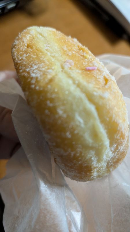 A staple of Mister Donuts, the angel cream donut is a classic, fluffy round donut filled with a light, sweet whipped cream and dusted with powdered sugar.