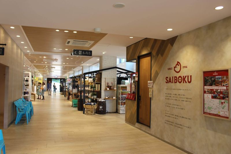 Market Hall is in the first building as you come into Metsa from the Entrance Road. There are two floors. It is a modern building with large windows and a high ceiling creating a lofty, bright feel. The hall has a selection of high end shops selling food or souvenirs or novelty items. You can pick up some take away food, freshly baked, and eat outside with a view of Miyazawa lake. There are tables outside with parasols and cool mist blowing to keep the area marginally cooler in summer. There are toilets and baby changing and feeding facilities nearby.