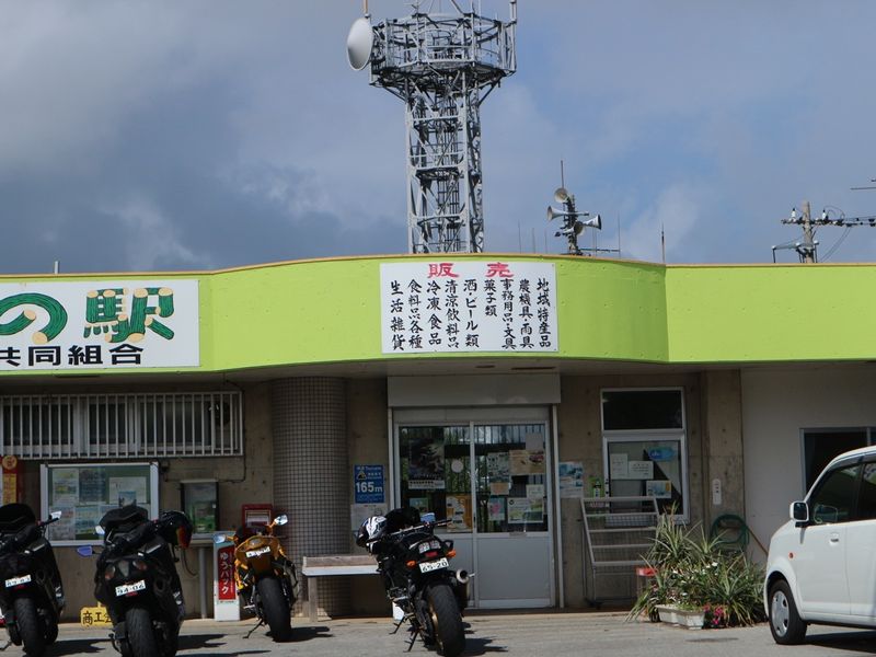Yama no Eki (山の駅), or full name - Takae Kyoudou Kumiai Yamanoeki (高江共同組合 山の駅) is a humble rest stop located in the hill area of Takae just off the coast of northeast Okinawa Island. As rest stops in Okinawa go, this is very much a simple affair but it stands out in a remote area where there is little on offer for the driver to choose from in terms of getting a bit of sustenance and having a toilet break. Yama no Eki consists of a solitary building which is easy to spot by its bright green and white frontage. Out front there are one or two vending machines, a public pay phone and notices about local goings on (in Japanese). To the right of the building is bit of a sheltered seating area, occupied by some some serious looking bikers at the time of visiting. To be fair, Yama no Eki sells quite a bit of product including a lot of booze (strange for a rest stop, if that’s actually what this place is) and local produce. If one can speak Japanese, it could be a good place to pick up information about directions and the local area. The parking out front is small for a rest stop but one imagines that this place doesn’t see much traffic. This is largely an area of tight, winding lanes through some very quiet land. That being said, looking back at the map there is a coffee shop and a natural foods store nearby, not that we spotted them. There is, however, little else here. The area is a pleasant one and isn’t without some intrigue. Just next to Yama no Eki we saw some of the anti-army base posters and banners that you sometimes see dotted about Okinawa. We’re near to one of the bases here. So, should you be driving in Okinawa in this area and in need of the loo or a quick drink, this is a serviceable rest stop. Nothing else.