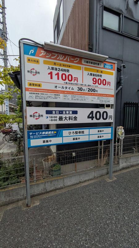 I had to use Apple Park parking lot in a bind, when all the other coin parking lots were full. It's a hidden spot and has really bad access so despite only having three parking spaces, is often empty! With good reason - it is very hard to get into in a large car, there are only two spots for large cars and the third is for a "Kei" small car. Its 200 yen for 30 minutes, which is less than others in the area. However, while others in the area have a maximum charge of between 800 and 1000 day for the day, this one costs 1100 yen for the day.