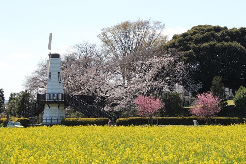 Miharashi Park is only just a small park in Kita Ward, Saitama City. All it has is some picnic benches, a playground and its iconic windmill. However, for two weeks in spring it attracts hundreds of visitors for the rare scene of windmill, cherry blossoms and rapeseed. While the park itself is quite small, its actually just a one minute walk from a larger park: Citizen's Forest Minuma Green park. That has even more attractions. There is no official parking for Miharashi park, but you can park in the Citizen's Forest Minuma Green park. The car park on the south end of the park is right by Miharashi park.
