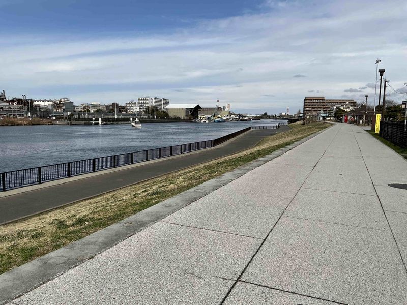 This sliver of park on the Old Edo River is named after the Joyato, a stone navigation lantern erected in the early 1800s. The lantern was an important navigation light for commerce on the river, and pilgrims headed for Naritasan Shinshoji who crossed on ferries. Today, it isn't as bustling but you'll see commercial and private boats on the river. The river walk is a paved path on the elevated riverbank with some lawn space. It has a public toilet at the north end. On your walk, make a pit stop here, as there aren't many other toilets in the area.