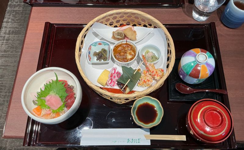 Just southwest of Samukawa Shrine is Sanshuden, the shrine's event hall that hosts weddings and other celebrations associated with the shrine. The hall has a small restaurant with a varied menu - Chinese, western, and washoku set menus for lunch and dinner. We opted for the Gentei Ryuzen set. It includes three kinds of sushi over rice, various sides, chawan mushi, and miso soup. The server brings the set on a tray and removes the basket lid to reveal the dishes. The sushi rice was perfectly prepared, the various sides have contrasting flavours and textures, and the ensemble is a treat to look at and eat. It's filling, too.