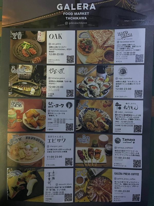 If you're like me, you appreciate food court style atmospheres when you're not quite sure what you want to eat and would prefer to go with what sounds good at the time. Galera Food Market in Tachikawa is a great spot to visit if that's the case, and they have a variety of different cuisine options. There's a taco place, coffee shop, champon restaurant, and even an oyster bar. In total you'll find 10 different businesses here, so you're almost guaranteed to find something that sounds good. Worth a visit if you're in the area.