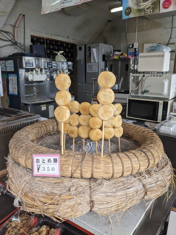 Kiritanpo, pounded rice on a skewer, is a famous specialty of Akita prefecture. Kiritanpo Chaya is located on the Aomori side of Lake Towada, but it is right beside Akita. Apart from the Kiritanpo the shop also sells ice-cream, cooled cucumbers, latte drinks with frozen fruit and other snacks too. There is an indoor seating area, with a lake view, but it seems to be closed right now. You can sit on some stools made from wood along the boardwalk.