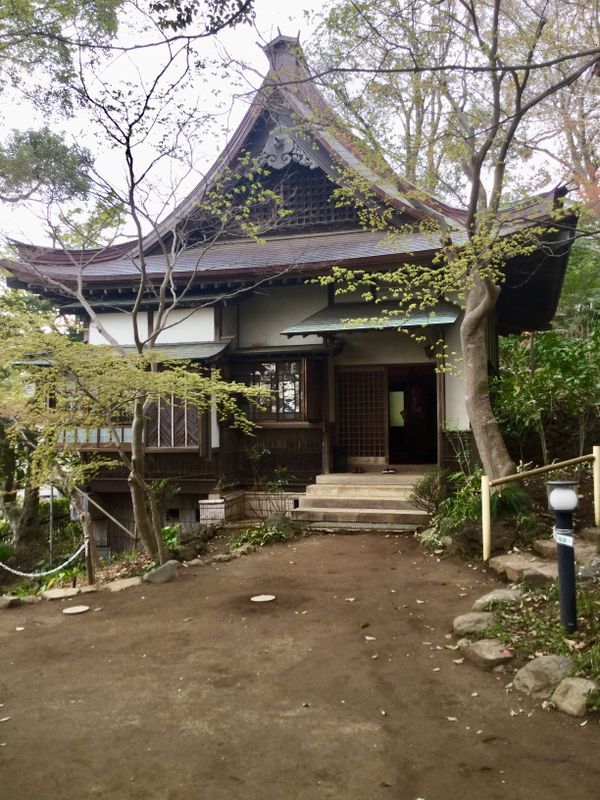 This tiny summer house was built by a western history scholar, Kengo Murakawa. The villa was built in the Taisho Period and has a few unique features. Just inside the front door, there is a tokonoma that spans the north wall. Some furniture made by Bernard Leach and Jomon Period artifacts are on display. For my companion and I, it was curiously nostalgic since we had both been educated in school buildings and lived in houses dating from the same era in Europe and North America. You’ll see parquet floors, brass hardware and rippled glass in the solid wood doors besides distinctly Japanese architectural features. Admission is free, and the villa is open every day except Mondays.