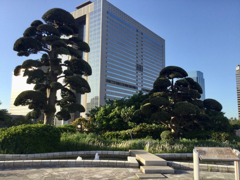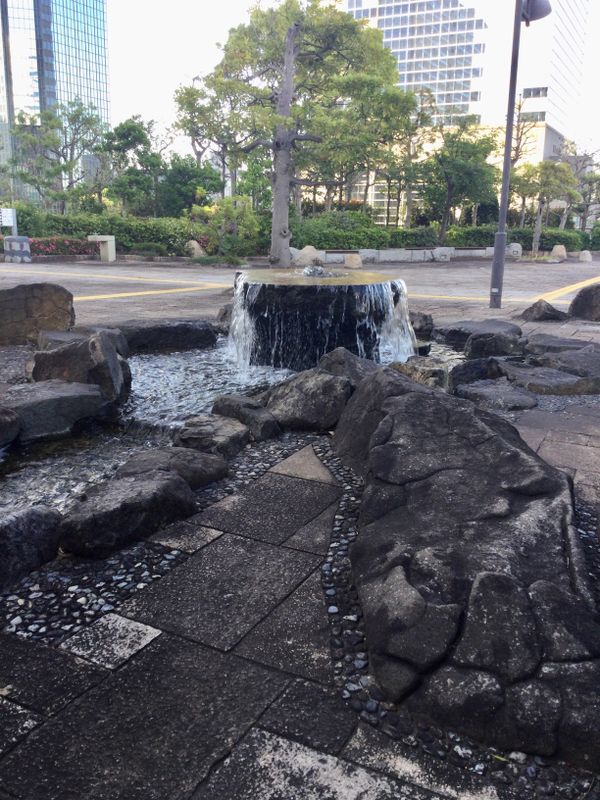 I feel dwarfed by the massive buildings and wide boulevards whenever I visit Makuhari New Town in Chiba City. Events there draw huge crowds and I need a breather. A few minute's walk northwest of Kaihinmakuhari Station is an elevated linear green space, a "mall" in the sense of a promenade, running north and south affording great views between the buildings looking towards Tokyo Bay. The space feels intimate with plazas, an artificial stream with stepping stones, lush greenery, and bench seating.