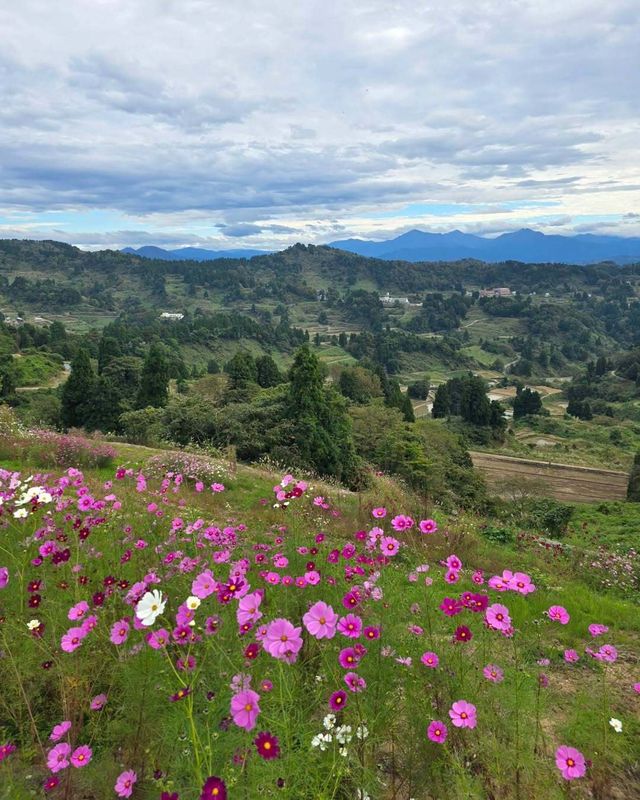 Yakushi no Oka (or the tomb of Yakushi) is a place where you can get some great views of the Echigo Sanzan mountains, rice fields, and seasonal flowers at certain times of year. Right now it's a great place for cosmos, and it's free! The scenery really is postcard-worthy, so go and check it out if you're a local.