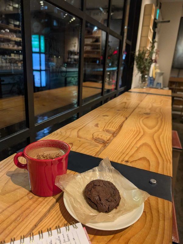 I have been on a quest to find the best hot chocolate since moving to Japan and I am pleased to announce that we might have found our very first nominee! On a cold and rainy evening when all cafes close by 8pm I was searching for a cafe to study in while my partner goes off to practice. I was looking for cafes around the Hamacho station and found this hidden gem with pretty good ratings and late time timings. The cafe is on the main road and stays open up till 11PM. It has a very chill vibes with retro church music playing and long wooden tables with seating like a bar. The barista is quick and skillful to whip up your order and other than that quietly non-existent which gives you all the head space to your work. The menu is limited to just a page of beverages served hot or cold like the regular americano, expresso, latte, hot chocolate and some exotic ones like spiced chai and organic ginger ale. They do serve baked goods like cookies, brownies and carrot cake. I ordered the hot chocolate which as suggested by the title of this article was one if the best I've tried in Japan yet. I do have very high standards when it comes to hot cocoa and this felt more authentic that the usual instant cocoa powder mixed in with hot water combination I've mostly come across. Whole milk was used and a smooth silky cocoa which made a huge difference. It was dusted off with cocoa powder on top. I had also ordered a double chocolate cookie was was a bit off because I could still feel the crunch of the sugar crystals in it?? How did they not melt during the baking process??!? The quest for chunky chewy cookies shall continue.....