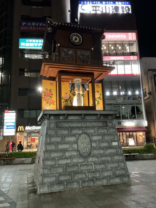 The Narita Puppet Clock Tower (Narita Karakuri Tokei) is a delight you ought to stick around for when you pass through Narita Station. The clock's mechanism rises on the hour to reveal two scenes with music and puppets. The scenes are from the Narita Gion Festival held in July, and an adaptation of the kabuki classic, Kagami Jishi. The clock is a delight, but I highly recommend taking in the Gion Festival with elaborate floats, thundering drums, dancing, and processions. On Fridays and Saturdays, the clock displays from 8 a.m. to 10 p.m. Other days, the last show is at 8 p.m.