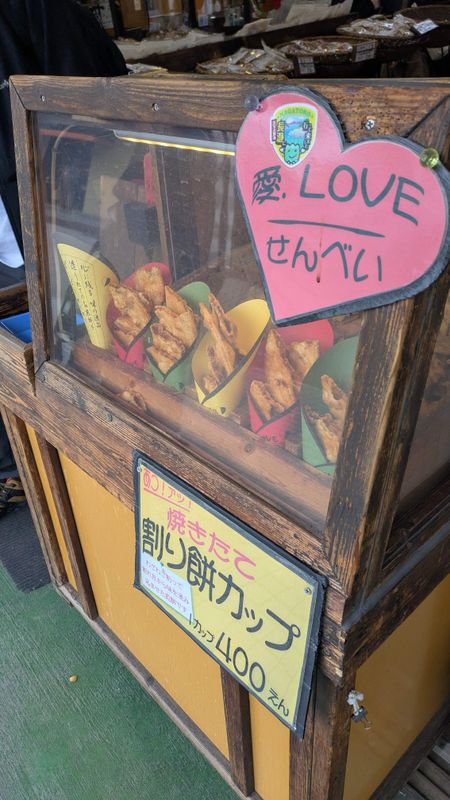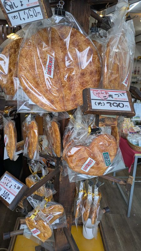 Raijindo specializes in hand-baked senbei rice crackers. They've branches all over Kanto. This branch is within Travel Store Marubutsu very close to Nagatoro staion. They've a great selection of sembei, some in unusual shapes and sizes. Moreover, you can buy freshly baked - right off the grlil - sembei from a kiosk in the store. There is a small seating area too.