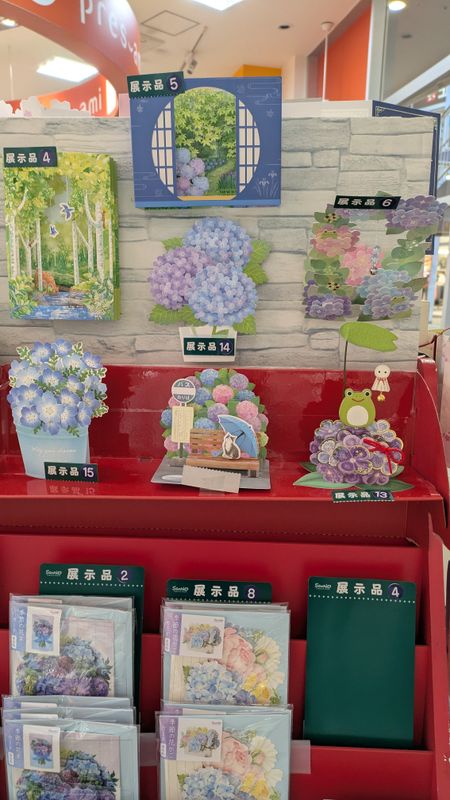 The One's Terrace (a chain store) at Wakaba Walk has some really gorgeous greeting cards, such as the ones pictured. They also have paper craft as well as regular stationery. They sell some novelty goods too. They have a pretty good "Snoopy" and "Sumikkogurashi" selections. They normally sell "Bonbon Drops", but they are currently sold out.