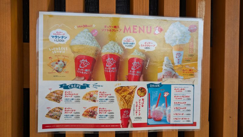 Since the Benibana no Sato Roadside Station opened last year, this creperie has had a long, long queue every time I visited. I hadn't planned to go there today, but when I saw from the park across the road that there was no queue, I took the opportunity to try it out. I only had to wait a couple of minutes. Supposedly on the weekend the minimum wait is 40 minutes unless you're first in the queue! I've yet to try the crepes. The mini "soft" was good value - 320 yen. They serve the delicious ice-cream in the shape of a safflower! I will definitely go again - I want to get the kids one of the crepes.
